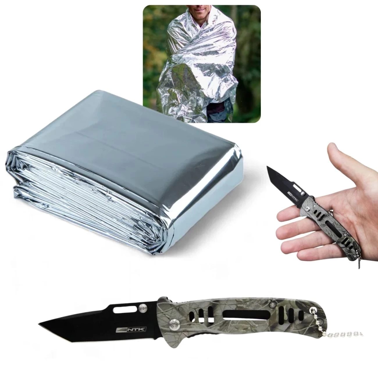 Kit Manta Térmica Aluminizada para Emergência + Canivete Dexter Aço Inoxidável Ntk