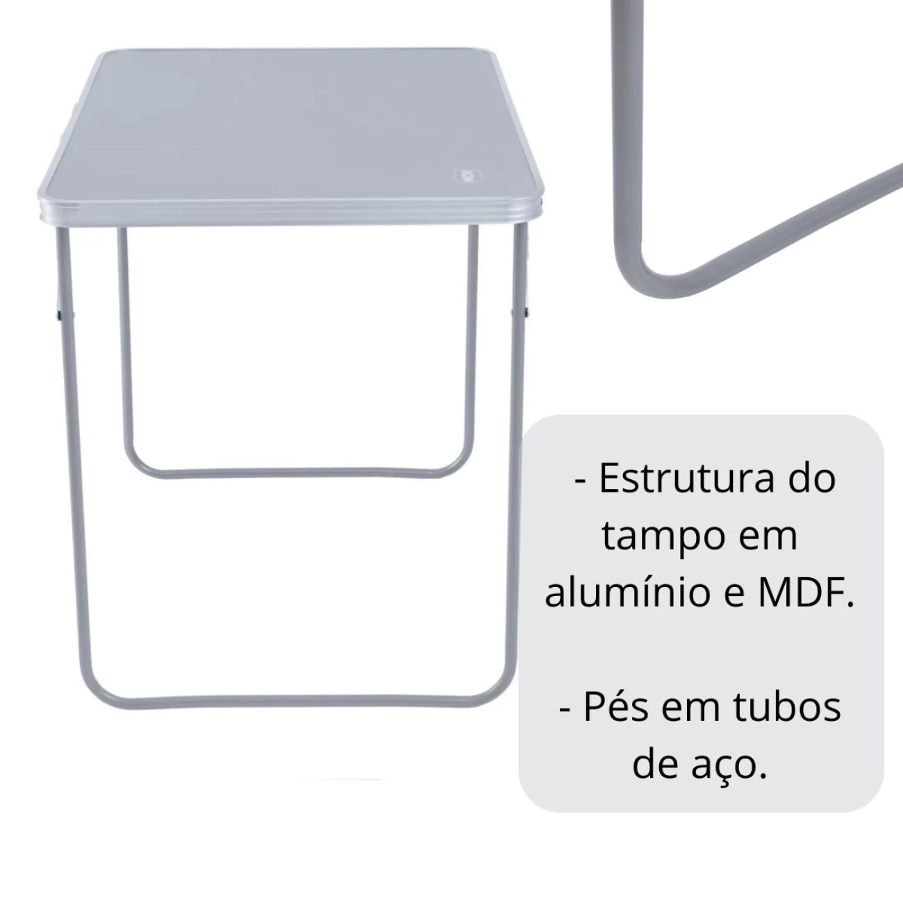 :: Composição: - Estrutura do tampo em alumínio e MDF; - Pés em tubos de aço; - Alça em polipropileno e aço.